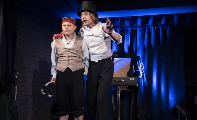 В «Режиссерских уроках Е. Б. Вахтангова» описывается репетиция первой сцены из «Принцессы Турандот» среди учеников третьей студии МХТ. Евгений Богратионович заставил не участвующих студийцев сесть вокруг импровизированной сцены, а играющие ходили между ними, переговаривались через их сидящие тела, с публикой общались сборщики податей, просили «заплатить» за представление, и так далее. Так вот сцена Арт-кафе как раз располагает к подобным «фишкам»! Маленький подиум, места для музыкантов и кулисы за занавеской – что еще нужно для площадного театра? Премьере Александра Коручекова «Сказка о Попе...