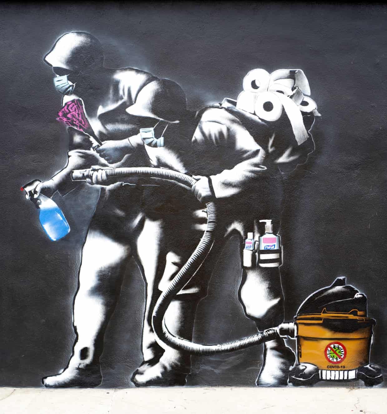 Одну из крупнейших работ создал художник Higack Art в Лос-Анджелесе. Автор запечатлел двух солдат, охотящихся на коронавирус с помощью средств дезинфекции. Сам автор назвал ситуацию с эпидемией «военным временем» после того, как в магазинах закончились продукты и средства гигиены.