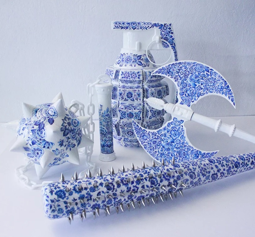Парижская художница Хелена Хаус представила свои новые работы. Она создала серию оружия из керамики и расписала ее вручную. Для украшения она выбрала голубой цветочный орнамент, который традиционно можно увидеть на декоративных тарелках и горшках, но никак не на топоре или боевой бите. Художница поделилась, что идея ее проекта ― показать внутренний мир женщин.