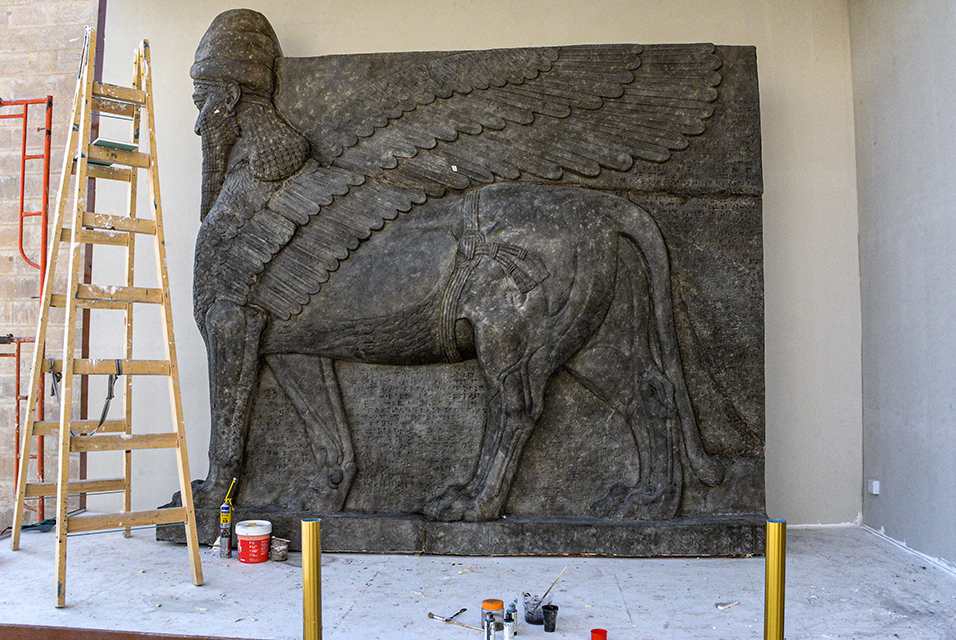 Работы изображают ассирийских божеств-защитников Ламассу. В древности они украшали вход в тронный зал в городе Нимруд. На протяжении долгого времени скульптуры хранились в Музее Мосула. Террористы уничтожили произведения, когда вторглись в северный Ирак в 2014 году. Иракские войска вернули Мосул в середине 2017 года, но музей остался закрытым.