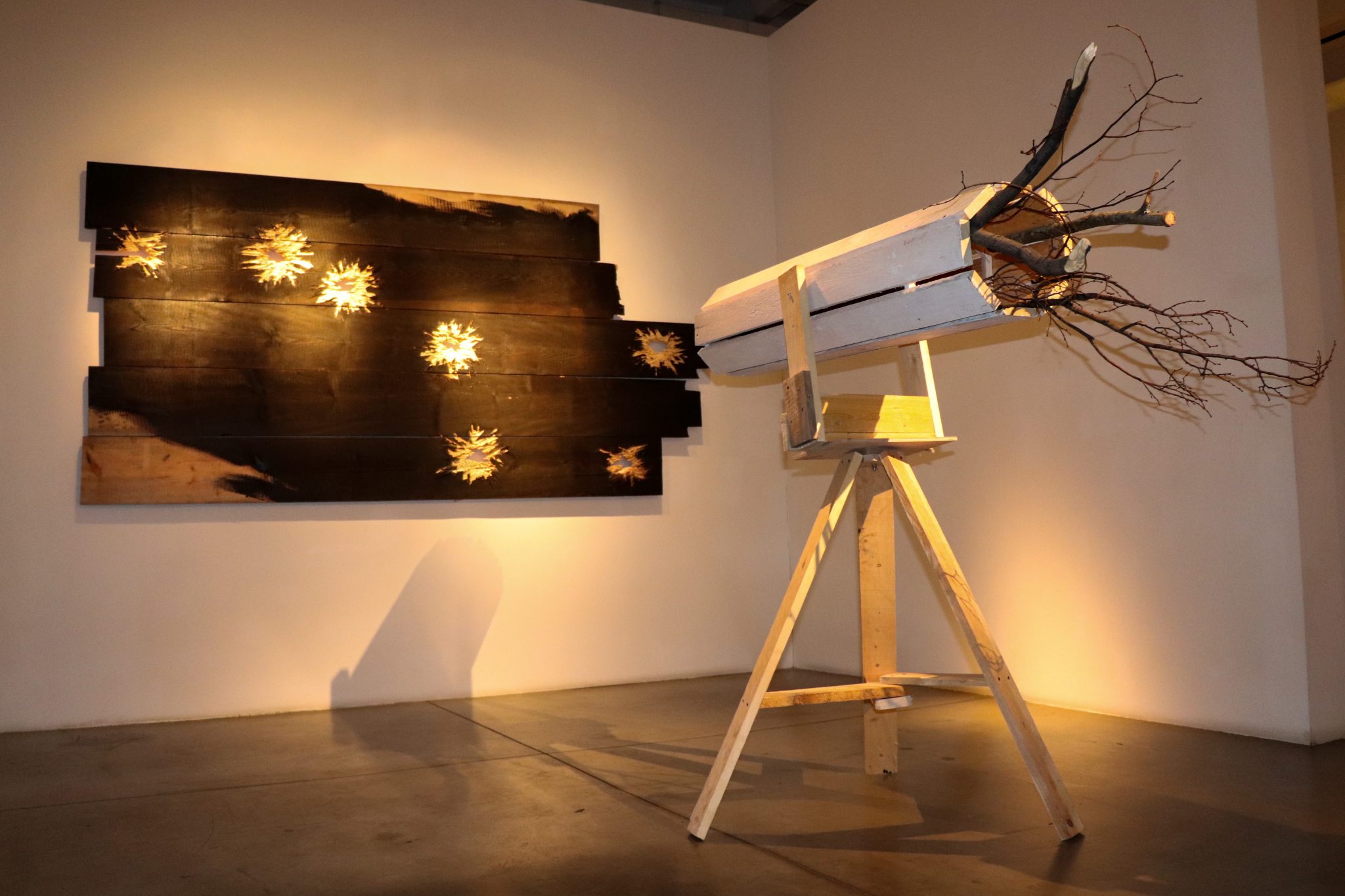 Мастер саморазрушающихся анти-архитектурных форм построил в галерейном пространстве тотальную инсталляцию из деревянных скульптур.